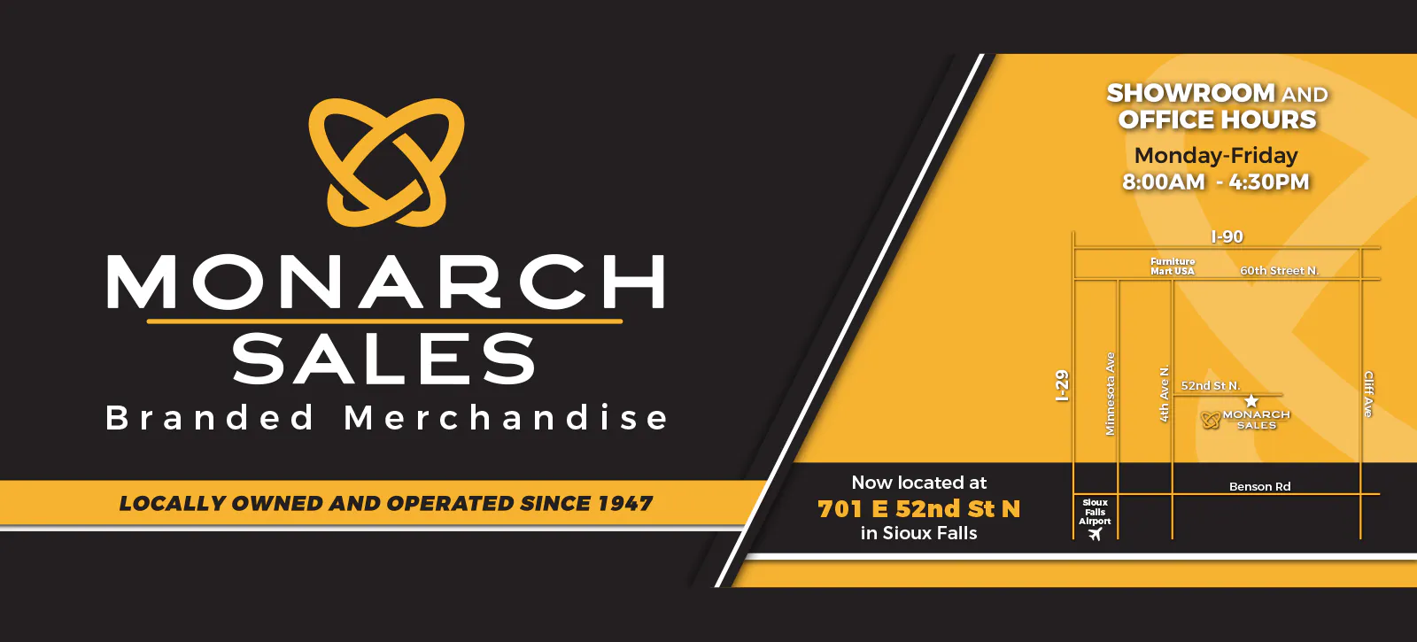 Family-owned and trusted since 1947, Monarch Sales specializes in crafting high-quality, custom-branded merchandise that makes a lasting impact. Partnering with some of the biggest brands in the industry, we offer a wide array of promotional items, apparel, and unique giveaways to help businesses of all sizes elevate their brand presence. With over 75 years of expertise, we’re committed to delivering personalized service and premium products tailored to meet your exact needs. Based in Sioux Falls, South Dakota, we’re your dedicated partner in creating memorable merchandise that brings your brand vision to life.
